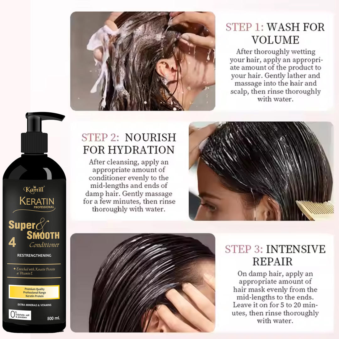 Bring back life, shine, and smoothness to your hair with Kamill Keratin Super Smooth Conditioner No. 4, a salon-grade formulation designed to deliver deep nourishment and long-lasting smoothness. Infused with Hydrolyzed Keratin, Argan Oil, and Vitamin E, this conditioner repairs damaged strands, tames frizz, and restores lost protein to your hair.
